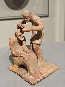 Boiotian Greek painted terracotta figure dating between c. 500 and c. 475 BCE, currently held in the Museum of Fine Arts, showing a barber cutting a man's hair