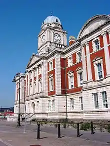 Behind the docks rose the terraced houses of Barry which, with Cadoxton, soon formed a sizeable town. The railways which had played a major part in the development of the dock helped make Barry Island a popular resort. Barry Memorial Hall on Gladstone Road was inaugurated in November 1932, and obtained its name to honour those locals who lost their lives in World War I.[24]