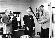 The doughnut was created by former New York Yankees catcher Elston Howard. Howard, in 1955, was the first African-American player on the Yankees' roster. He played catcher and the outfield during his time with the Yankees. The first team to invest in Howard's product was the St. Louis Cardinals. This essentially got players out of the habit of swinging multiple bats to warm up.[1] While Howard is credited with inventing the doughnut, he did not make the amount of money he had hoped due to other companies making their own versions of the batting doughnut. Howard and his supporters did not have the funds to take the companies to court.[1] During a game a doughnut usually is in the on-deck circle. The player in the on-deck circle normally swings a bat and stretches to prepare for their at-bat. The different doughnuts weigh varying amounts. The doughnut is discarded in the on-deck circle when the player moves into the batter's box.[1] The weight was later dubbed the "doughnut" and the "iron doughnut".[3]
