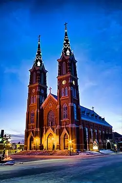 A new church building program was begun in the mid-1880s. The parish decided on a large Gothic Revival style building in order to serve the increased population. Dubuque architects Fridolin Heer Sr. and his son Fridolin Heer Jr. designed the church. The priest at the time, Anton Kortenkamp (1834-1889), also had the foresight to have the altar placed upon a foundation of solid rock, which is one of the requirements for an altar to be consecrated. Construction was begun in 1887, and the cornerstone was laid on June 3, 1888. The new church was dedicated by Bishop John Hennessy on December 3, 1889. When the building was dedicated, special trains brought people from all over the state of Iowa to witness the ceremony. It cost approximately $100,000 dollars to build the church.[2] After the completion of the present building, the old church was converted into classrooms. It was later torn down after a new school was completed. Electric lights were added to the church in 1904.