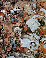 The size of the Muscovite army remains an unsolved question. Narrative Lithuanian sources generally give large numbers. King Sigismund wrote to Pope Leo X about a "horde of Muscovites" which consisted of 80,000 men.[9] Sigismund also claimed that his army had killed 30,000 Muscovites and taken prisoner 46 commanders and 1,500 nobles. Extant Polish and Lithuanian documents, however, list all captured nobles by name; only 611 men in all. The Polish historian Bohun considers it improvident to rely on what he terms "propaganda data" given by Sigismund.[10] Gembarowicz (another Polish researcher) is of the opinion that the Muscovite army was about 40,000 strong. It also remains unclear why – if the figure of 70,000–80,000 men is to be trusted – King Sigismund (who knew about this superiority of the Muscovite army from Mikhail Glinsky's letters) kept a personal guard of about 5,000 men (about 15% of his army) in reserve, without sending them into the battle. The Muscovite chronicles (Novgorodian and Sophian codexes) claim a Lithuanian numerical superiority.[5]