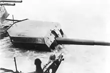 From her opening salvo, Graf Spee's gunfire proved fairly accurate, her third salvo straddling Exeter. At 06:23, a 283 mm (11.1 in) shell burst just short of Exeter, abreast the ship. Splinters from the shell killed the torpedo tubes' crews, damaged the ship's communications, riddled the ship's funnels and searchlights and wrecked the ship's Walrus aircraft just as it was about to be launched for gunnery spotting. Three minutes later, Exeter suffered a direct hit on her "B" turret, putting it and its two guns out of action. Shrapnel swept the bridge, killing or wounding all bridge personnel except the captain and two others.[22] Captain Bell's communications were wrecked. Communications from the aft conning position were also destroyed. The ship had to be steered via a chain of messengers for the rest of the battle.[20]