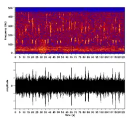 In underwater acoustics and fisheries acoustics the term is also used to mean the effect of plants and animals on sound propagated underwater, usually in reference to the use of sonar technology for biomass estimation.[2][3] The study of substrate-borne vibrations used by animals is considered by some a distinct field called biotremology.[4]