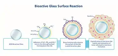When implanted, Bioglass 45S5 reacts with the surrounding physiological fluid, causing the formation of a hydroxyl carbonated apatite (HCA) layer at the material surface. The HCA layer has a similar composition to hydroxyapatite, the mineral phase of bone, a quality which allows for strong interaction and integration with bone. The process by which this reaction occurs can be separated into 12 steps. The first 5 steps are related to the Bioglass response to the environment within the body, and occur rapidly at the material surface over several hours.[17] Reaction steps 6-10 detail the reaction of the body to the integration of the biomaterial, and the process of integration with bone. These stages occur over the scale of several weeks or months.[18] The steps are separated as follows:[17][18]