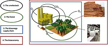 The climate impact of bioenergy varies considerably depending on where biomass feedstocks come from and how they are grown.[3] For example, burning wood for energy releases carbon dioxide; those emissions can be significantly offset if the trees that were harvested are replaced by new trees in a well-managed forest, as the new trees will remove carbon dioxide from the air as they grow.[4] However, the establishment and cultivation of bioenergy crops can displace natural ecosystems, degrade soils, take land out of food production and consume water resources and synthetic fertilisers.[5][6]