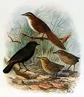 Illustration of the black robin, the Chatham fernbird, and Lyall's wren, extinct birds from its region, by John Gerrard Keulemans