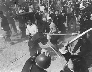 Initially, the protesters succeeded in occupying the plaza without incident, gathering together to wave flags, snake dance, and sing protest songs.[1] However shortly thereafter a large contingent of police officers arrived on the scene and commanded the protesters to clear the plaza. The protesters refused to leave, and a bloody struggle commenced in which protesters armed with paving stones, baseball bats, wooden staves, pachinko balls, bamboo spears, and even some Molotov cocktails faced off against police armed with pistols, tear gas, and batons.[6][2] Eventually, the police fired what they later claimed were "warning shots" with their service pistols, but some of these shots were aimed directly into the crowd, killing two protesters and wounding twenty-two others.[1]