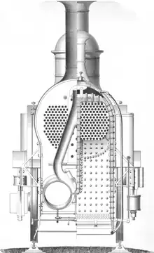 Sections of a steam locomotive showing the many fire-tubes which carry the hot gases of the fire through the boiler to heat the water and so create steam.