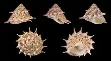 The size of the shell varies between 15 mm and 40 mm. Its color pattern is creamy yellow with radial dark purple flammules dorsally and ventrally, grading off on the anterior side to crimson and rose pink. The separate tubercles have dark color giving the effect of dots. The rather small shell has a conical shape. It shows long, spirally arranged peripheral spines on all five whorls (about equal to width of shoulder). The whorls are flat-sided. The early whorls show, on the upper surface, five beaded spirals, between which on the later whorls are intercalated one or more much smaller beaded or simple threads. These are crossed obliquely by small, sharp, imbricated lamellae, visible only under a lens. At the periphery the thin keel is produced into narrow, guttered spines with two or three radial threads on each. The body whorl carries 10 to 15 triangular spines. The base is elegantly flammulated with dark purple, sculptured like the upper side, having one strong nodulous and seven or eight smaller spirals and the same imbricate minor sculpture. The peripheral keel should have, when intact, about 20 spines. The shell lacks a sutural channel. The white columella has a very narrow basal, milk-white callus. The aperture is rounded. The outer lip leadis at the suture, which is laid on the prominent basal spiral before mentioned. The aperture is white except where the color markings show through the glaze.