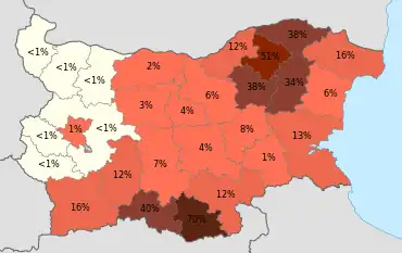 Distribution of the Bulgarian Turks by province, according to the 2021 Bulgarian census.[37][30]