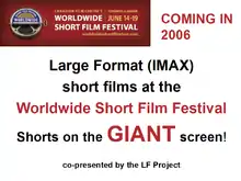 Promotional sign for the LF Project: a screening of large format, 15/70mm (IMAX) short films, on display at the 2005 Worldwide Short Film Festival. For references on the Large Format Project and the production of 15/70mm short films, see these on-line archives:[8][9][10][11][12]