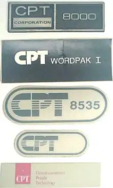 The CPT logo—originally three letters chosen to sound well together—began to be taken as an acronym for "cassette powered typewriting," and subsequently for "computer processed text," and numerous other variants. Major competition was IBM, Wang, Lanier, Xerox, and other word processing vendors.[3]