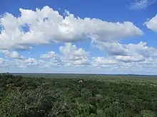 Calakmul is located in Campeche state in southeastern Mexico, about 35 kilometres (22 mi) north of the border with Guatemala and 38 kilometres (24 mi) north of the ruins of El Mirador.[4] The ruins of El Tintal are 68 kilometres (42 mi) to the southwest of Calakmul and were linked to both El Mirador and Calakmul itself by causeway.[5] Calakmul was about 20 kilometres (12 mi) south of the contemporary city of Oxpemul and approximately 25 kilometres (16 mi) southwest of La Muñeca.[6] The city is located on a rise about 35 metres (115 ft) above a large seasonal swamp lying to the west,[7] known as the El Laberinto bajo (a Spanish word used in the region to denote a low-lying area of seasonal marshland).[8] This swamp measures approximately 34 by 8 kilometres (21.1 by 5.0 mi) and was an important source of water during the rainy season.[8] The bajo was linked to a sophisticated water-control system including both natural and artificial features such as gullies and canals that encircled a 22-square-kilometre (8.5 sq mi) area around the site core, an area considered as Inner Calakmul.[8] The location of Calakmul at the edge of a bajo provided two additional advantages: the fertile soils along the edge of the swamp and access to abundant flint nodules.[5] The city is situated on a promontory formed by a natural 35-metre (115 ft) high limestone dome rising above the surrounding lowlands.[5] This dome was artificially levelled by the Maya.[9] During the Preclassic and Classic periods settlement was concentrated along the edge of the El Laberinto bajo, during the Classic period structures were also built on high ground and small islands in the swamp where flint was worked.[5]