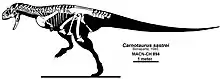 The skeleton was collected on a farm named "Pocho Sastre" near Bajada Moreno in the Telsen Department of Chubut Province, Argentina.[5] Because it was embedded in a large hematite concretion, a very hard kind of rock, preparation was complicated and progressed slowly.[9][5] In 1985, Bonaparte published a note presenting Carnotaurus sastrei as a new genus and species and briefly describing the skull and lower jaw.[5] The generic name Carnotaurus is derived from the Latin carno [carnis] ("flesh") and taurus ("bull") and can be translated with "meat-eating bull", an allusion to the animal's bull-like horns.[10] The specific name sastrei honors Angel Sastre, the owner of the ranch where the skeleton was found.[11] A comprehensive description of the whole skeleton followed in 1990.[4] After Abelisaurus, Carnotaurus was the second member of the family Abelisauridae that was discovered.[12] For years, it was by far the best-understood member of its family, and also the best-understood theropod from the Southern Hemisphere.[13][14] It was not until the 21st century that similar well-preserved abelisaurids were described, including Aucasaurus, Majungasaurus and Skorpiovenator, allowing scientists to re-evaluate certain aspects of the anatomy of Carnotaurus.[upper-alpha 6] The holotype skeleton is displayed in the Argentine Museum of Natural Sciences, Bernardino Rivadavia;[upper-alpha 7] replicas can be seen in this and other museums around the world.[15] Sculptors Stephen and Sylvia Czerkas manufactured a life-sized sculpture of Carnotaurus that was previously on display at the Natural History Museum of Los Angeles County. This sculpture, ordered by the museum during the mid-1980s, is probably the first life restoration of a theropod showing accurate skin.[7][16]