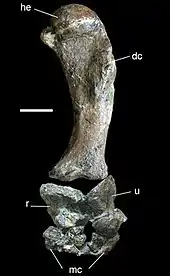 The forelimbs were proportionally shorter than in any other large carnivorous dinosaurs, including tyrannosaurids.[upper-alpha 33] The forearm was only a quarter the size of the upper arm. There were no carpalia in the hand, so that the metacarpals articulated directly with the forearm.[29] The hand showed four basic digits,[4] though apparently only the middle two of these ended in finger bones, while the fourth consisted of a single splint-like metacarpal that may have represented an external 'spur'. The fingers themselves were fused and immobile, and may have lacked claws.[30] Carnotaurus differed from all other abelisaurids in having proportionally shorter and more robust forelimbs, and in having the fourth, splint-like metacarpal as the longest bone in the hand.[29] A 2009 study suggests that the arms were vestigial in abelisaurids, because nerve fibers responsible for stimulus transmission were reduced to an extent seen in today's emus and kiwis, which also have vestigial forelimbs.[31]