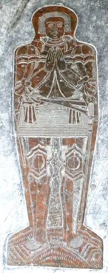Sir Philip's son and heir, Sir William Cary (1437–1471), of Cockington, was beheaded after the defeat of the Lancastrians at the Battle of Tewkesbury in 1471.[13] He is believed to be represented by a monumental brass of a knight, without surviving identifying inscription, set into a slate ledger stone on the floor of the chancel of All Saints Church, Clovelly, next to a smaller brass, in similar style, of his son and heir Robert Cary (died 1540).[6] He married twice: