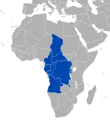 Central Africa is a subregion of the African continent comprising various countries according to different definitions. Middle Africa is an analogous term used by the United Nations in its geoscheme for Africa and consists of the following countries: Angola, Burundi, Cameroon, Central African Republic, Chad, Democratic Republic of the Congo, Republic of the Congo, Equatorial Guinea, Gabon, Rwanda, and São Tomé and Príncipe.[1] These eleven countries are members of the Economic Community of Central African States (ECCAS).[1] Six of those countries (Cameroon, Central African Republic, Chad, Equatorial Guinea, Gabon, and Republic of the Congo) are also members of the Economic and Monetary Community of Central Africa (CEMAC) and share a common currency, the Central African CFA franc.[2]