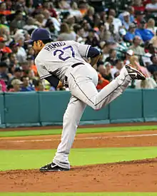 On December 17, 2010, a deal was finalized that sent Ramos, along with Adam Russell, Brandon Gomes and Cole Figueroa, to the Tampa Bay Rays for Jason Bartlett and a player to be named later.[1] In 2011, Ramos appeared in 59 games, pitching 43+23 innings with a 3.92 ERA. He spent much of the next season with the Triple–A Durham Bulls, but he appeared in 17 games for Tampa Bay and registered a 2.10 ERA over 30 innings. In 2013, Ramos threw 52 innings in 48 games with a 4.14 ERA.[2][3]