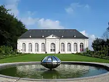 The park was laid out following the construction of the Château in the 1760s in a formal late baroque French style. The central axis of the alley, the courtyard and the middle bay of the corps de logis is continued in the park. A parterre with a path in the middle was situated directly behind the castle and ended on the banks of a formal pond. Close to the wall surrounding the park an Orangery was built facing the south. This building can still be seen. Northwards, the axis is aligned with the church spire in the village of Seneffe.