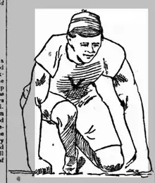 The following Spring he introduced the crouch start to track and field athletics. From the earliest days of pedestrianism runners started their races by standing at the start line, front foot behind the line, bending forward slightly from the waist. At the Rockaway Hunting Club Games, Cedarhurst, Long Island, on Saturday 12 May 1888, the first item on the programme was the 100 yards for undergraduates. The four competitors were Charles H. Sherrill (Yale Un.), Sam Dericksen (Columbia Un.), S. J. King (Princeton Un.), and F. B. Lund (Harvard Un.). When the Yale man crouched down at the start the starter, thinking that Sherrill did not know how to start, held up the race to give him instructions. Eventually the starter was persuaded that Sherrill knew what he was doing, and that he was employing a new start. He won "handily," in 10 1/2 seconds. Later the same afternoon he also won the 220 yards in 22 3/5.[8]