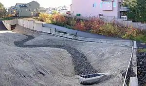 Check dams are made of a variety of materials. Because they are typically used as temporary structures, they are often made of cheap and accessible materials such as rocks, gravel, logs, hay bales, and sandbags.[9][15] Of these, logs and rock check dams are usually permanent or semi-permanent, and sandbag check dams are built primarily for temporary purposes. Also, there are check dams that are constructed with rockfill or wooden boards. These dams are usually implemented only in small, open channels that drain 10 acres (0.04 km2) or less; and usually do not exceed 2 ft (0.61 m) high.[16] Woven wire can be used to construct check dams in order to hold fine material in a gully. It is typically used in environments where the gully has a moderate slope (less than 10%), small drainage area, and in regions where flood flows do not typically carry large rocks or boulders.[17][15] In nearly all instances, erosion control blankets, which are biodegradable open-weave blankets, are used in conjunction with check dams. These blankets help encourage vegetation growth on the slopes, shorelines and ditch bottoms.