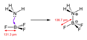 A coordinate covalent bond is a covalent bond in which the two shared bonding electrons are from the same one of the atoms involved in the bond. For example, boron trifluoride (BF3) and ammonia (NH3) form an adduct or coordination complex F3B←NH3 with a B–N bond in which a lone pair of electrons on N is shared with an empty atomic orbital on B. BF3 with an empty orbital is described as an electron pair acceptor or Lewis acid, while NH3 with a lone pair that can be shared is described as an electron-pair donor or Lewis base. The electrons are shared roughly equally between the atoms in contrast to ionic bonding. Such bonding is shown by an arrow pointing to the Lewis acid. (In the Figure, solid lines are bonds in the plane of the diagram, wedged bonds point towards the observer, and dashed bonds point away from the observer.)