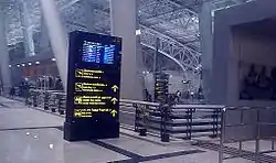 The new Integrated Terminal (Terminal 2) commenced main operations on 7 July 2023, with 26 airlines moving to the terminal. Many retail shops being opened as they move from the previous terminals to the new one.[57] The new terminal is designed with the inspiration of Tamil Nadu culture, with the building's roof being inspired by the pleats of the Bharatanatyam costume, a traditional dress worn by dancers. The flooring and the false ceiling feature Kolam patterns, a type of design found in front of Tamil houses during special occasions.[58] The outside of the terminal features a 1,730-kilogram lamp named the Nachiarkovil Lamp. The design of the pillars erected near the entry gates are inspired by the palm trees found all over the state of Tamil Nadu.[59]
