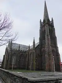 The church is constructed in red sandstone ashlar with a slate roof, and is in Decorated style. The plan consists of a two-bay nave without aisles, north and south transepts, a chancel, north and south vestries, and a west tower and spire. The tower has a west entrance with a window above it, and three tiers of blind arcading above that. The bell openings are paired, and the parapet has fretted tracery. The spire is recessed, decorated with crockets, and supported by flying buttresses. The bays of the nave and transepts are divided by gabled buttresses that rise to pinnacles, and each bay contains a three-light window. There are doorways on the north and south sides of the transepts; these are flanked by canopied niches containing statues.[2]