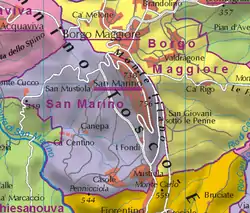 It is the third largest city in the country, after Dogana and Borgo Maggiore. It borders the San Marino municipalities Acquaviva, Borgo Maggiore, Fiorentino, and Chiesanuova and the Italian municipality San Leo.