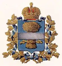 The new design of the coat of arms had been approved on 25 February 1869, by Alexander II of Russia, the emperor of the Russian Empire. It depicted an orange (golden) sheaf of hay, tied up with an orange band, placed on a blue French style escutcheon. In the middle of the coat of arms was placed horizontally a grey (silver) wavy line. Around the shield, there are yellow (golden) leaves of the oak tree, interspersed with the blue ribbon of the Order of St. Andrew. On the top of the coat of arms, above the escutcheon, there was the yellow (golden) Imperial Crown of Russia. The coat of arms remained in the use until 1915.[12]