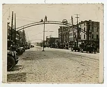 The first arches, used to light areas during the Grand Army of the Republic convention, were made of wood and used gas lighting.[1] The arches installed in 1896 were of metal, with electric lights.[3] They became used to support electric streetcars' overhead lines.[1] They were illuminated at night, providing a luminous glow especially in wet or icy conditions.[3]