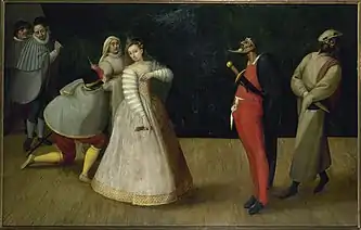 Commedia dell'arte (/kɒˈmeɪdiə dɛlˈɑːrteɪ, kə-, -ˈmɛdiə, -ˈɑːrtiː/;[1][2] Italian: [komˈmɛːdja delˈlarte]; lit. 'comedy of the profession')[3] was an early form of professional theatre, originating from Italian theatre, that was popular throughout Europe between the 16th and 18th centuries.[4][5] It was formerly called Italian comedy in English and is also known as commedia alla maschera, commedia improvviso, and commedia dell'arte all'improvviso.[6] Characterized by masked "types", commedia was responsible for the rise of actresses such as Isabella Andreini[7] and improvised performances based on sketches or scenarios.[8][9] A commedia, such as The Tooth Puller, is both scripted and improvised.[8][10] Characters' entrances and exits are scripted. A special characteristic of commedia is the lazzo, a joke or "something foolish or witty", usually well known to the performers and to some extent a scripted routine.[10][11] Another characteristic of commedia is pantomime, which is mostly used by the character Arlecchino, now better known as Harlequin.[12]