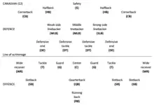 These are the player positions for both offensive and defensive. Note that eleven players per side are used, as opposed to twelve.