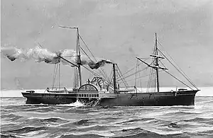 The naval college was housed on board the CSS Patrick Henry, a seagoing sidewheel steamer with a walking-beam engine and brigantine rigged,[3] armed with ten guns, and a veteran of the Battle of Hampton Roads. Anchored seven miles south of Richmond, Virginia at Drewry's Bluff, near the Confederate States Marine Corps Camp Beall, "she had now become the most realistic war college that ever existed."[4] Located there, Patrick Henry served the additional purpose of potentially being sunk as an obstruction in the James River channel. The CSS Patrick Henry could only accommodate 52 midshipmen, 20 officers, professors and crew, which limited and helped dictate the size of the naval college.