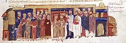 Constantine IX's preferential treatment of Maria Skleraina in the early part of his reign led to rumors that she was planning to murder Zoë and Theodora.[18] This led to a popular uprising by the citizens of Constantinople in 1044, which came dangerously close to harming Constantine as he participated in a religious procession. The mob was only quieted by the appearance at a balcony of Zoë and Theodora, who reassured the people that they were not in any danger of assassination.[19]