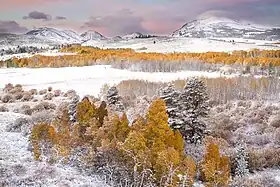 Conway Summit is named after John Andrew Conway, a settler in the area in 1880.[3][4] Geographically, it was formed from an upland plateau by the sinking of the land in the Mono basin area.[5] The Sawtooth Ridge of the eastern Sierra Nevada, topped by 12,279-foot (3,743 m) Matterhorn Peak, rise to the west of the pass; Green Creek and Virginia Lakes, in the Sierra Nevada to the west of the pass, are two local destinations for fishing, camping and aspen trees. The Bodie Hills and the infamous Bodie ghost town lie to the east.
