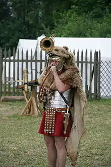 It was invented by the Etruscans for use in their funeral processions and military.[2][3] Roman artistic representations of the cornu are typically realistic. While Etruscan art usually depict the cornu in use alongside the lituus. It was likely a status symbol in Etruscan society.[4] The cornu was used in Roman religious rituals such as the worship of Dionysus or Cybele.[2][5] It was also used in sacrifices,[6] funerals, circus plays, gladiatorial games, and bacchanals.[7] The cornu was an ancient Roman musical instrument used in the ancient Roman military as a signaling instrument.[8][9] It was used to give signals to the entire unit.[10]