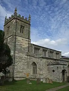 The village is dominated by the stately home of Coughton Court, which lies to the east of the A435 road. The parish church which is dedicated to St. Peter and is situated next to Coughton Court, consists of a chancel, north and south chapels, nave, north and south aisles, south porch, and west tower, with walls of rubble and ashlar.[9] The building of the present church is attributed to Sir Robert Thockmorton between 1486 and 1518[10] but parts of the tower are older and the plan of the nave follows the plan of an earlier structure;[9] the church was included in the original endowment of Studley Priory at its foundation by Peter Corbucion in the 12th century.[11] At the Dissolution of the Monasteries the church passed to Sir George Throckmorton, the then steward of the priory.[9] The nave contains the table tomb of Sir Robert Throckmorton, topped by a large slab of black marble,[10] but his remains do not lie here and the tomb is occupied by a later Sir Robert Throckmorton who died in 1791.