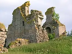 The ruins stand upon a knoll rising out of a plateau, between what appears to have been two marshes or lochans, and the ditches were originally cut between them. One ditch cuts the ridge 117m NE of the castle to form an outer bailey. The castle would have been effectively isolated from the 'mainland', and a significant barrier raised by the water to any potential besiegers at the period when the use of gunpowder was unknown. Two crumbling gables, portions of walls, and shreds of battlements remain, and in the 19th century several underground vaulted chambers survived, although partly filled with rubbish, and home to foxes and bats.[14] The entrance to the castle was at the south-west side by a drawbridge,[15] of which the abutment still survives.[16] The entrance pend or arched passage had a circular watch-tower or bastion to defend it. Within the closing wall was a courtyard surrounded by buildings, and from this courtyard there was an entrance into the great hall, long blocked up.[17]