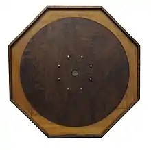 Board dimensions vary with a playing surface typically of polished wood or laminate approximately 26 inches (660 mm) in diameter. The arrangement is 3 concentric rings worth 5, 10, and 15 points as you move in from the outside. There is a shallow 20-point hole at the centre.[1] The inner 15-point ring is guarded with 8 small bumpers or posts. The outer ring of the board is divided into four quadrants. The outer edge of the board is raised slightly to keep errant shots from flying out, with a gutter between the playing surface and the edge to collect discarded pieces. Crokinole boards are typically octagonal or round in shape. The wooden discs are roughly checker-sized, slightly smaller in diameter than the board's central hole, and typically have one side slightly concave and one side slightly convex, mainly due to the inherent features of wood, more than a planned design. Alternatively, the game may be played with ring-shaped pieces with a central hole.