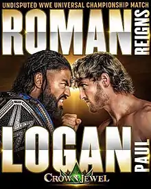 After Roman Reigns appeared on Logan Paul's podcast Impaulsive, the social media influencer then trash-talked Reigns after the latter left the set. This led to a social media exchange, resulting in Paul appearing on the September 16 episode of SmackDown[12] where he confronted The Bloodline to invite Reigns to a press conference in Las Vegas the following day.[13] At the conference, WWE executive Triple H announced that Reigns would defend the Undisputed WWE Universal Championship against Paul in the main event of Crown Jewel, marking only Paul's third match in WWE.[14] During the Crown Jewel press conference the day before the event, it was confirmed that while Reigns would have The Bloodline in his corner (except Sami Zayn),[lower-alpha 1] Paul would be backed by his brother Jake Paul.[16]