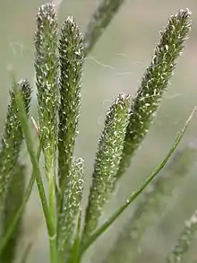 Crypsis alopecuroides is a species of grass known by the common name foxtail pricklegrass. It is native to Europe, the Middle East, and North Africa. It is also known in the western United States as a common and widespread introduced species, especially in sandy areas around water, such as lakesides. It has also been collected at shipping points near Philadelphia but has not been seen there in about a century.[1] This is an annual grass producing mostly upright and unbranching stems, often dark in color, up to about 75 centimeters in maximum height. The green leaves are up to 12 centimeters long, sometimes waxy in texture. The inflorescence is a dense cylindrical panicle of tiny green to purple spikelets.