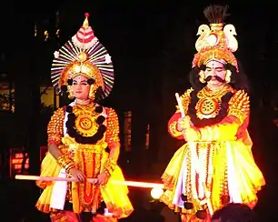 Yakshagana is not folk art but a popular traditional theatre of India performed in coastal and malenadu regions which is a blend of dance, music, songs, scholarly dialogue and colourful costumes. The word means "celestial music", and the dance drama is performed during the night (usually after the winter crop has been harvested).