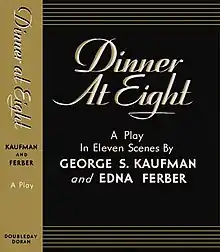 Dinner at Eight is a 1932 American play by George S. Kaufman and Edna Ferber. The plot deals with the Jordan family, who are planning a society dinner, and what they, as well as various friends and acquaintances—all of whom have their own problems and ambitions‚ do as they prepare for the event. The film adaptation Dinner at Eight followed and Mentone Productions released the spoof Supper at Six. Several revivals, a made-for-TV movie, and an opera followed.