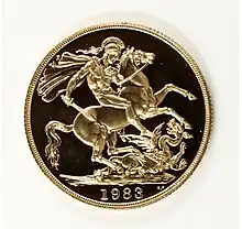 The Royal Mint realised there was a market for sovereign coins, and began to sell them to collectors at well over face or bullion value.[35] Since 1980, the double sovereign has been issued in most years. Coins from 1980 to 1983 (none were issued in 1981 or 1984) used the Arnold Machin effigy of Elizabeth, while the 1985–1996 coins used the Raphael Maklouf effigy and coins from 1998 to 2015 use the Ian Rank-Broadley effigy, mostly paired with Pistrucci's reverse, which was restored in 2009 to show additional detail of the dragon.[36] No double sovereigns were issued in 1986, 1994, 1995, 1997, 1999 or 2001, years in which the coin's place in the gold proof set was taken by a gold version of a commemorative £2 piece issued that year. In 1989, the usual designs were replaced with a commemorative evoking the design of the original English sovereign of 1489, by Bernard Sindall.[37][38]