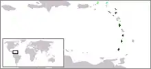 The members of the Organisation of Eastern Caribbean States (dark green) and associate members (light green). All use the East Caribbean dollar except for the British Virgin Islands, which uses the US dollar.