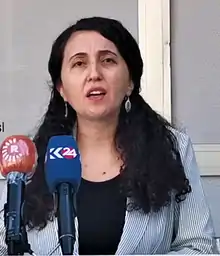 Ebru Güney was elected to the Turkish Parliament representing the HDP for Mardin in the parliamentary elections of June 2018[5] and is the current spokeswoman for the HDP.[6] She supports that Kurds can be educated in their native language if they wish and condemns the Turkish denial of Kurds.[7]