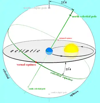 Because Earth's rotational axis is not perpendicular to its orbital plane, Earth's equatorial plane is not coplanar with the ecliptic plane, but is inclined to it by an angle of about 23.4°, which is known as the obliquity of the ecliptic.[8] If the equator is projected outward to the celestial sphere, forming the celestial equator, it crosses the ecliptic at two points known as the equinoxes. The Sun, in its apparent motion along the ecliptic, crosses the celestial equator at these points, one from south to north, the other from north to south.[5] The crossing from south to north is known as the vernal equinox, also known as the first point of Aries and the ascending node of the ecliptic on the celestial equator.[9] The crossing from north to south is the autumnal equinox or descending node.