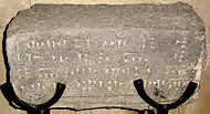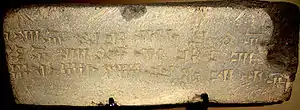 Urartian cuneiform script: "By the glory of God Ḫaldi, king Sarduri II, son of Argishti I, poured 10100 kapi of grain here.[2]