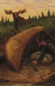 Shrapnel's subject matter encompassed landscape, genre, and still life.[14] His early works often depict the Muskoka region of Ontario,[10] and later of British Columbia.[14] Animals and indigenous peoples figure prominently, and he painted still lifes of fish. Some of his winter landscapes in oil are reminiscent of Cornelius Krieghoff.[10] He eschewed the dramatic and picturesque, managing to avoid the rigid strictures of composition and style as conventionally practiced.[7] Today, Shrapnel is best known for his watercolours of scenes across Canada.[15]